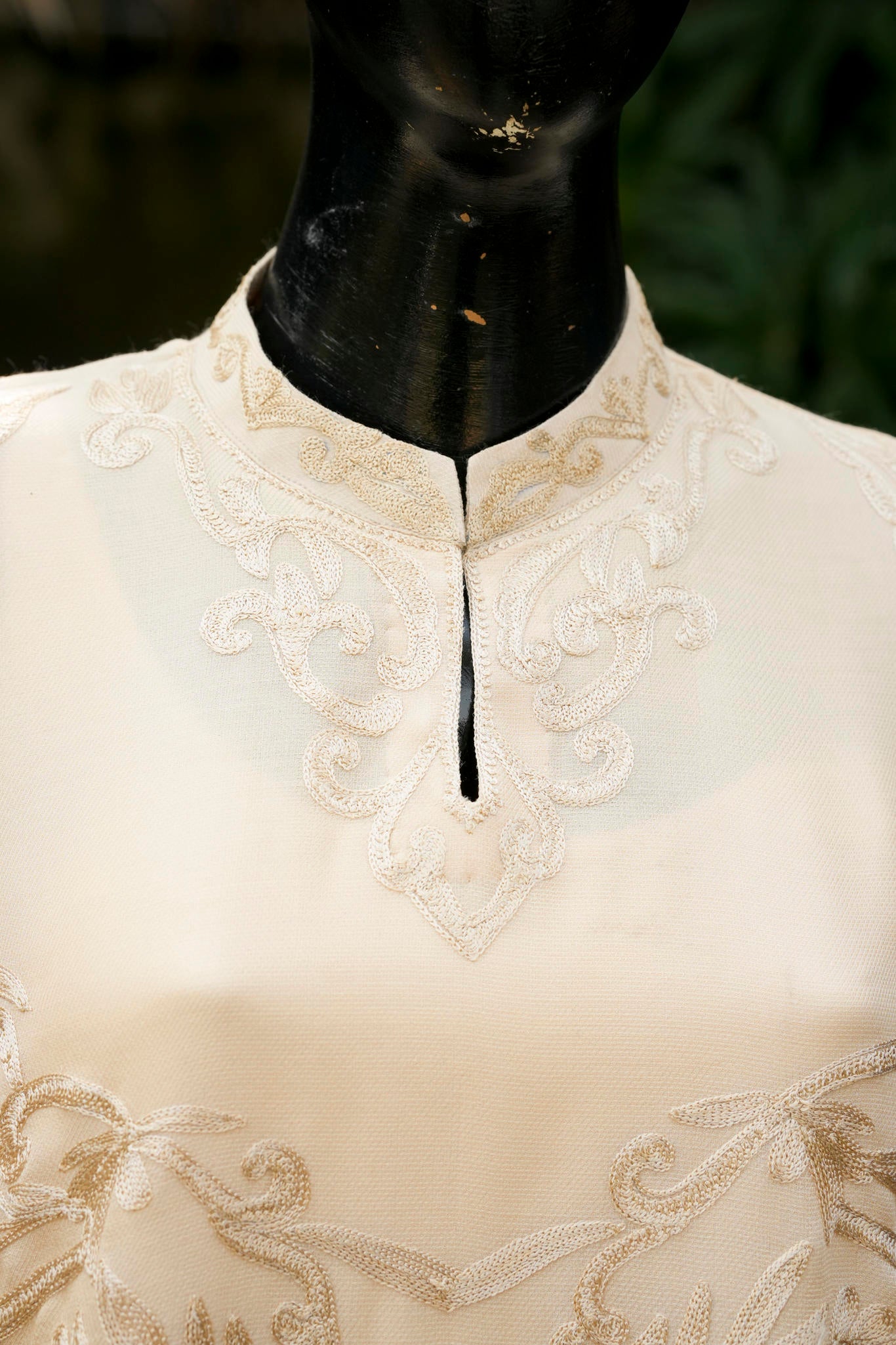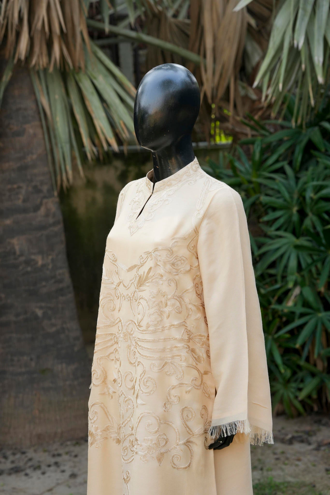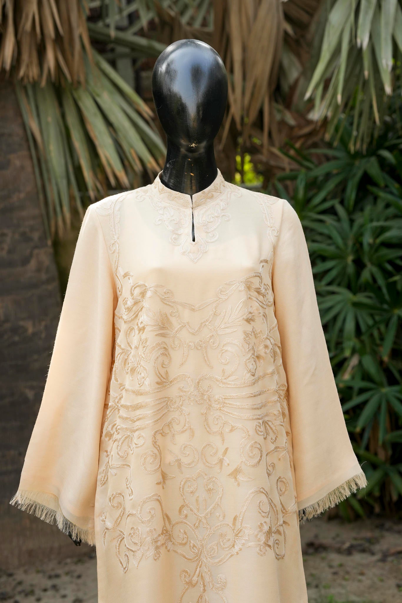 A refined blend of wool and silk, tailored into a graceful long shirt, enriched with intricate traditional Aari embroidery. A timeless expression of heritage craftsmanship, elevated with understated luxury and contemporary elegance.