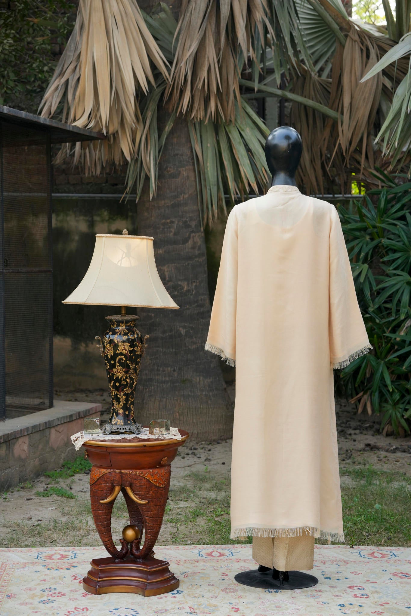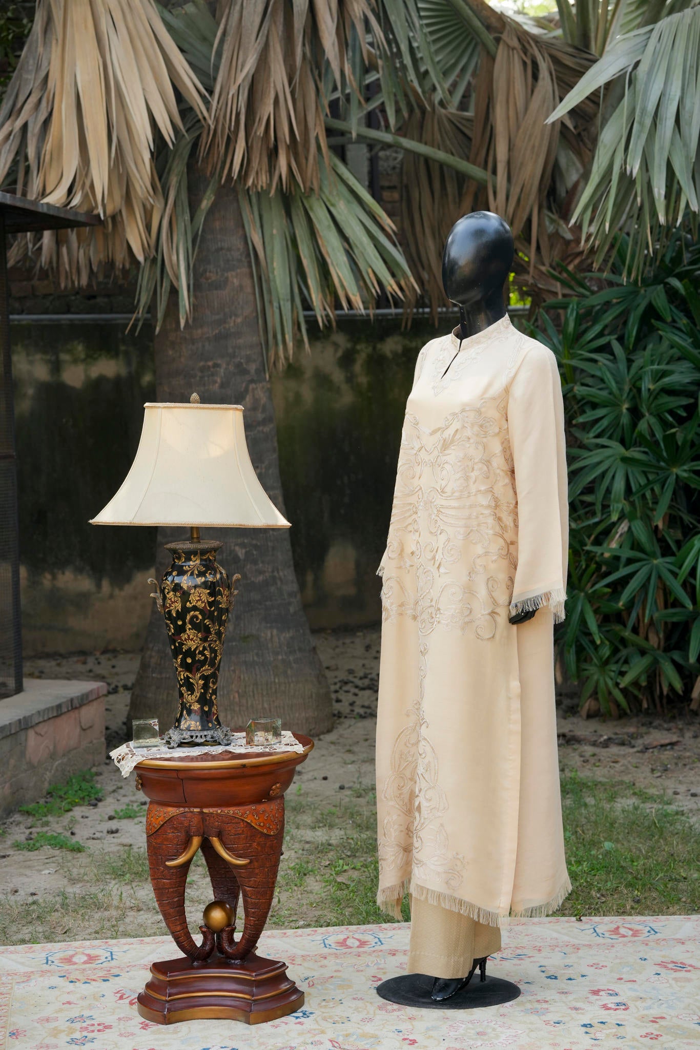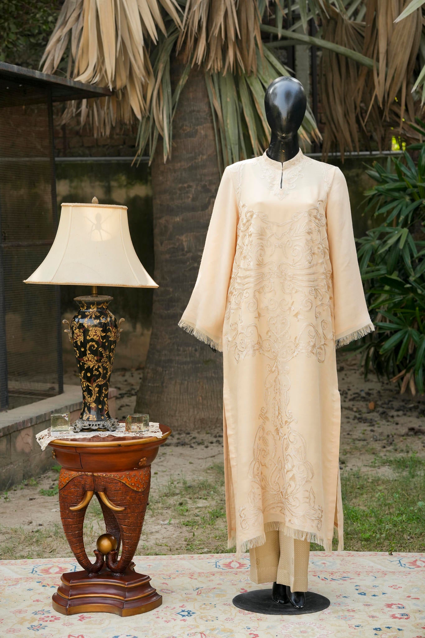 A refined blend of wool and silk, tailored into a graceful long shirt, enriched with intricate traditional Aari embroidery. A timeless expression of heritage craftsmanship, elevated with understated luxury and contemporary elegance.