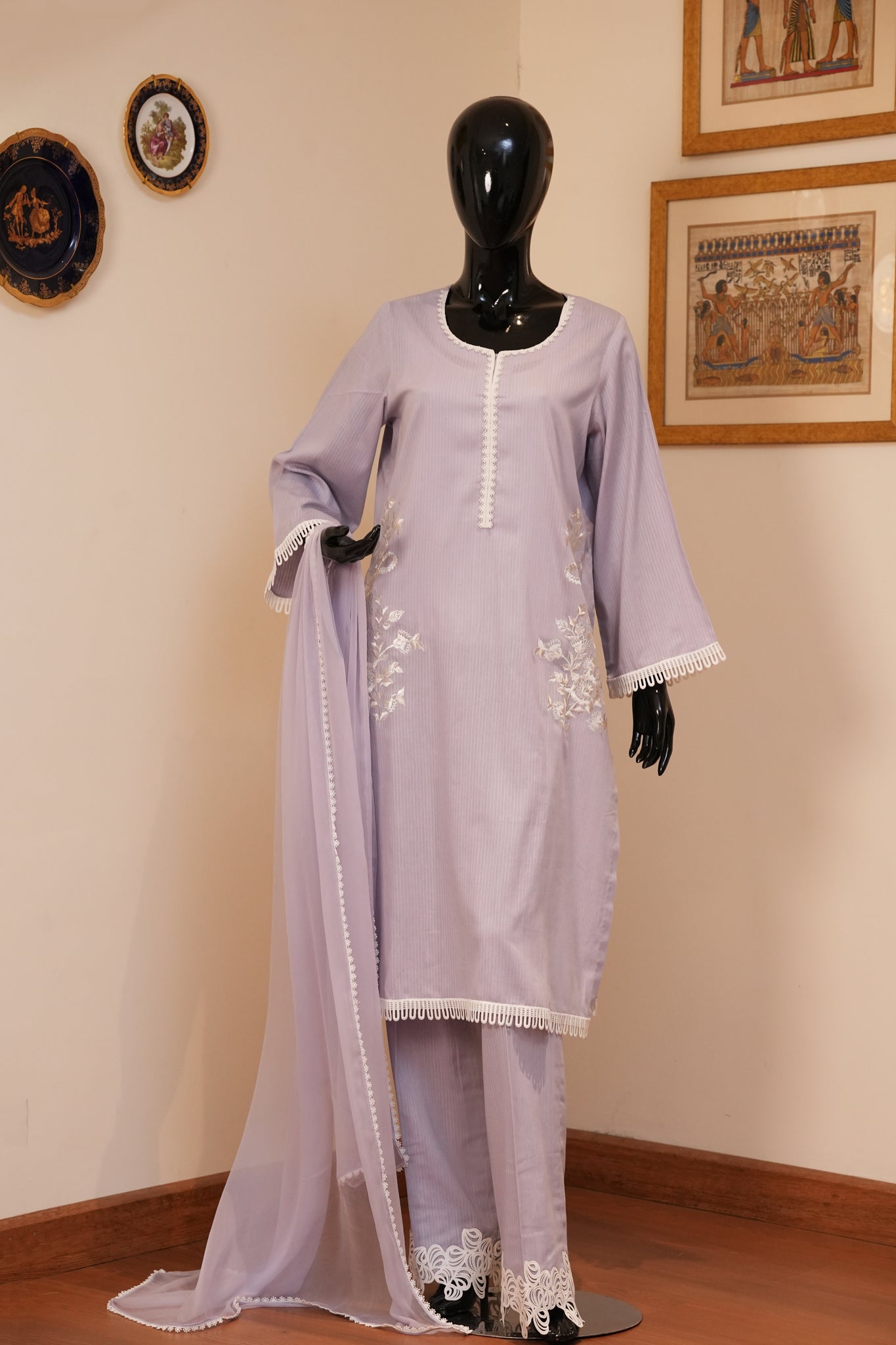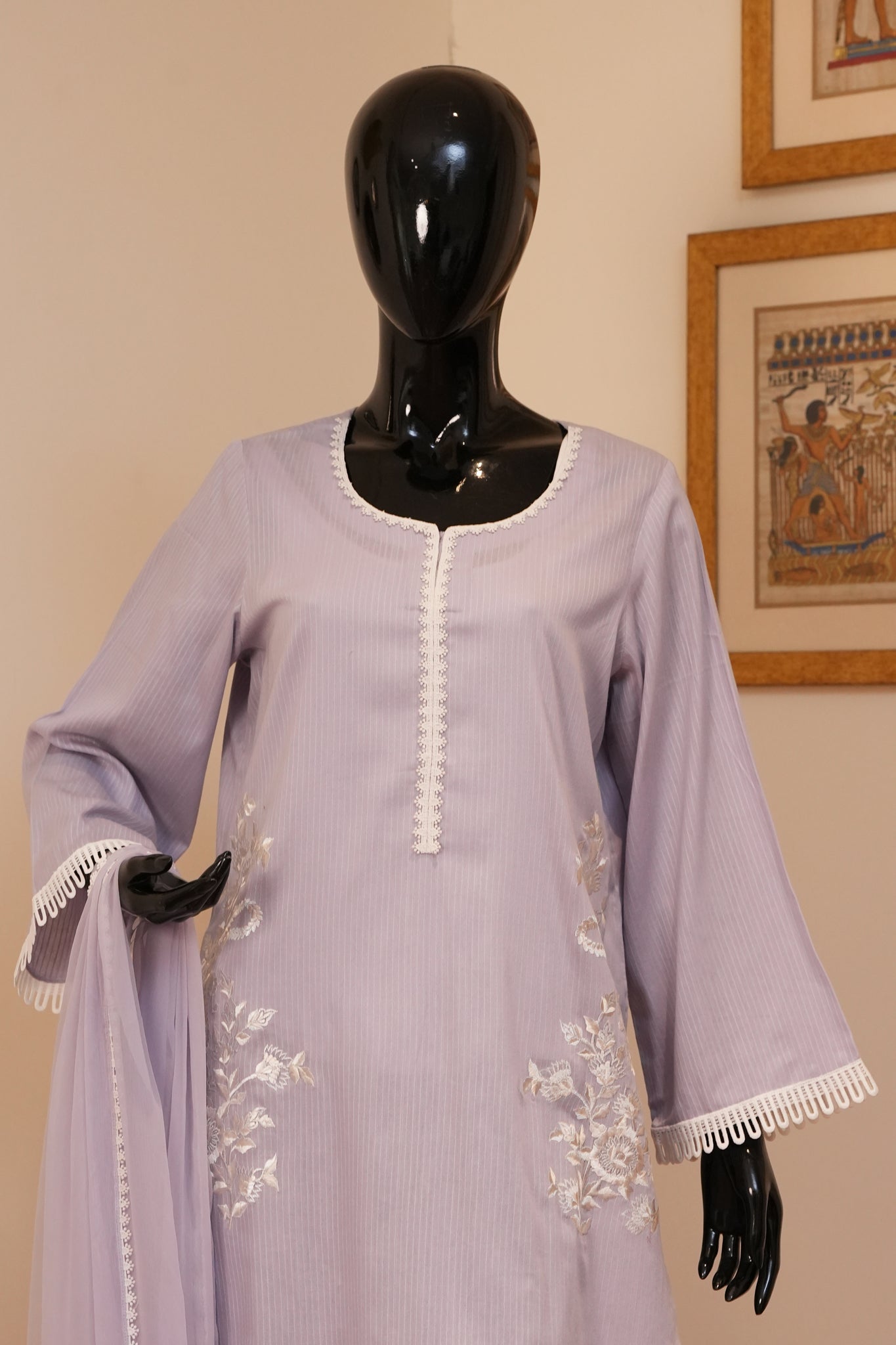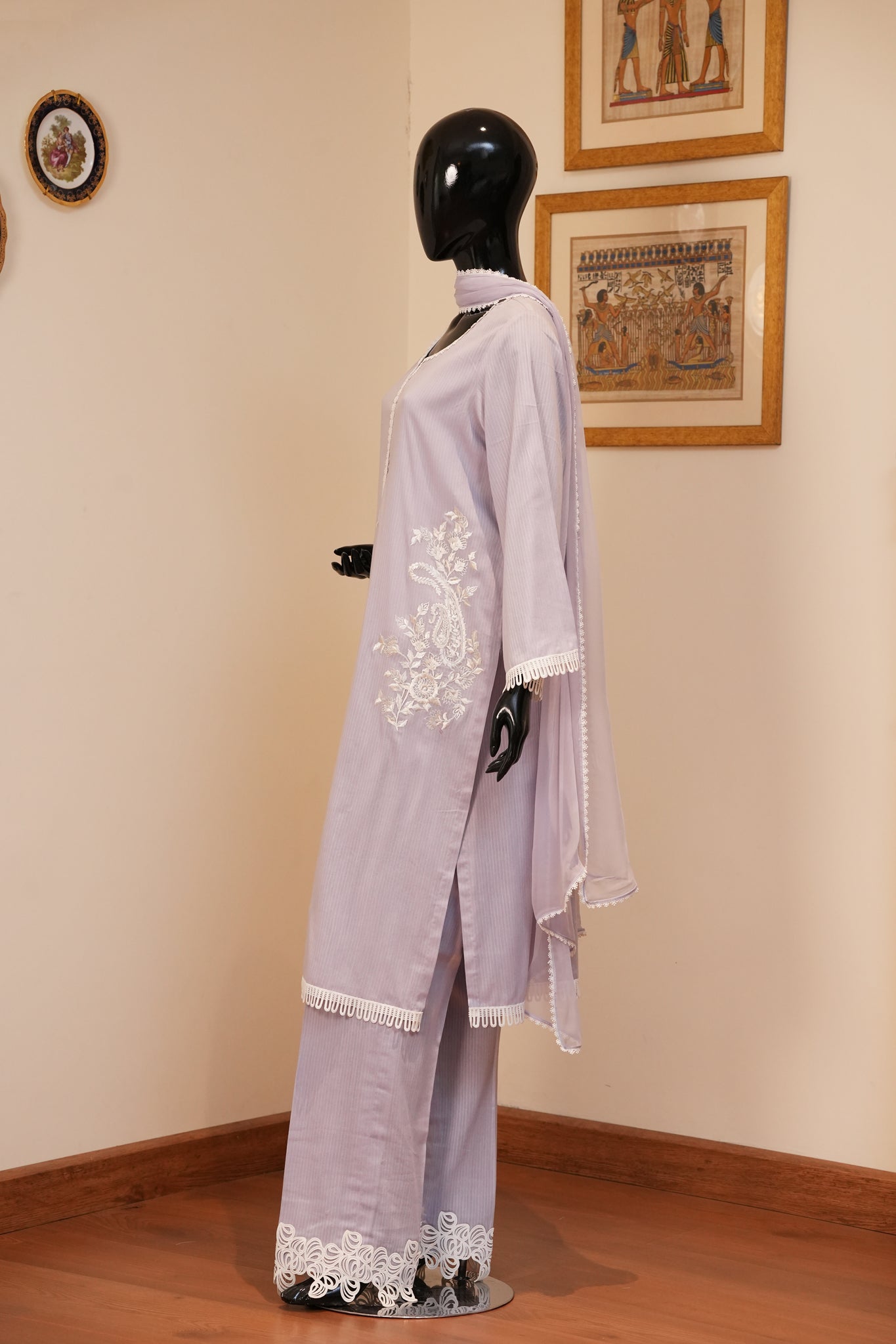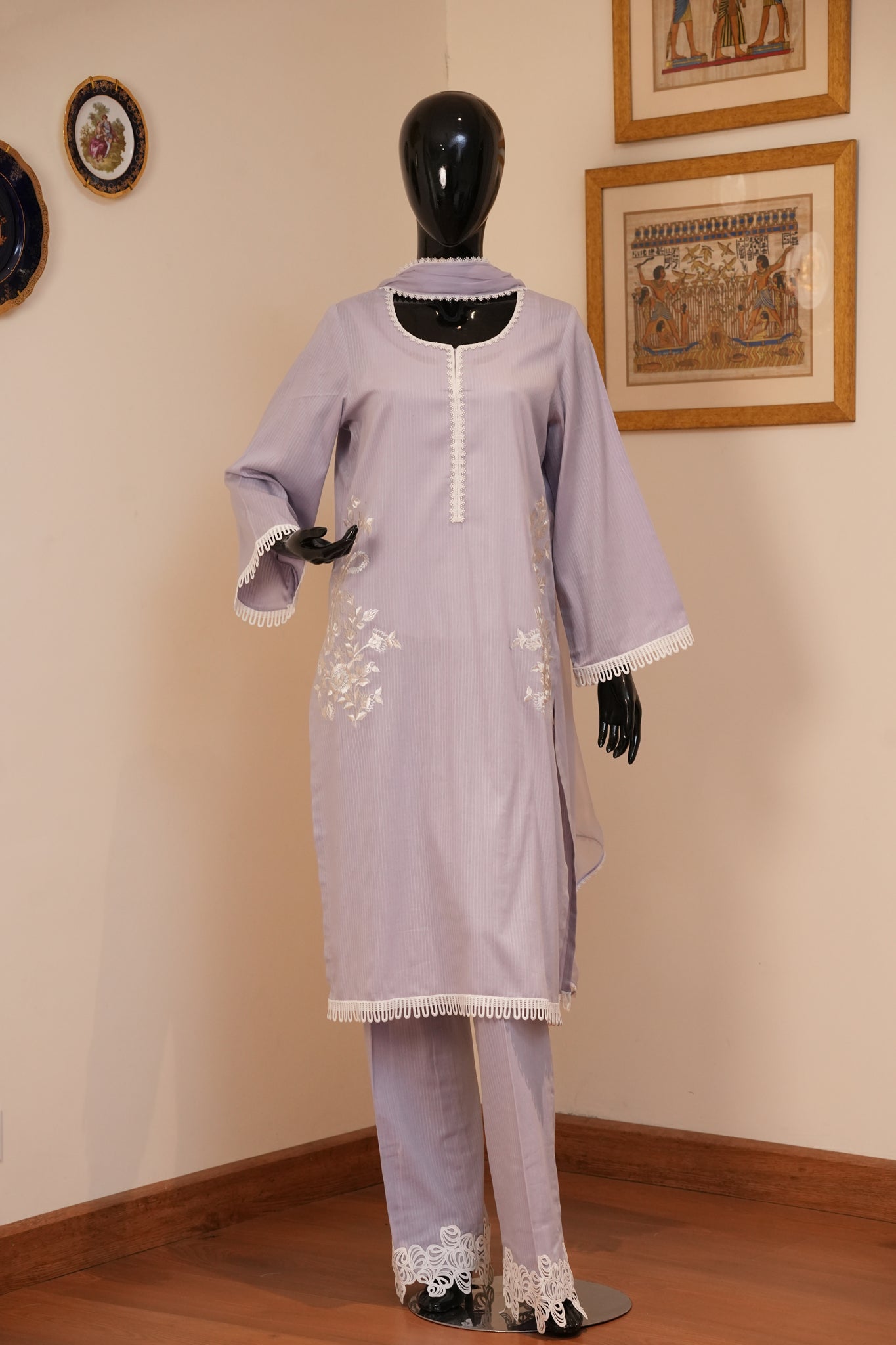 “Jamni” – a deep, rich shade inspired by the inner hue of black plum (Jamun), exuding sophistication and timeless elegance. The soft cotton fabric is beautifully adorned with intricate embroidery in off-white thread, creating a striking contrast against the deep base. Delicate embellishments grace the trousers and dupatta, adding a subtle yet luxurious touch. Perfectly blending tradition with contemporary finesse, this ensemble is ideal for making a refined statement