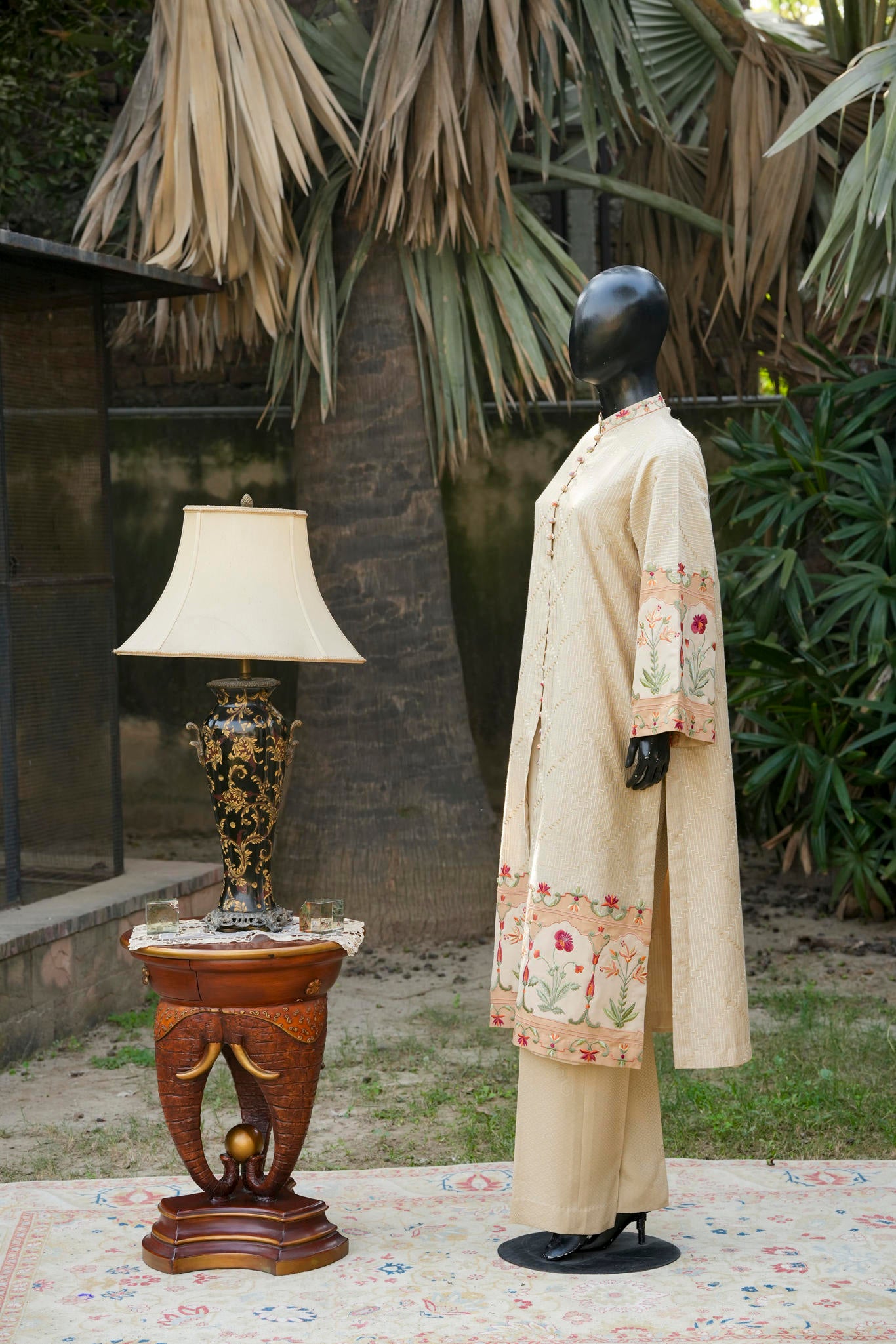 Inspired by the timeless floral motifs of Wazir Khan’s Mosque, this exquisitely crafted jacket features intricate machine embroidery, paired with a refined silk suit. A seamless fusion of heritage artistry and contemporary elegance, where tradition meets modern luxury.