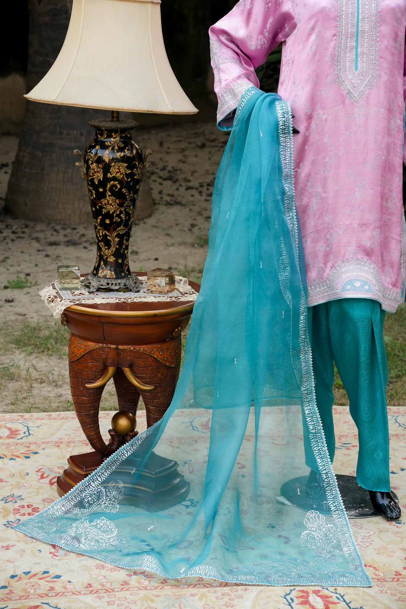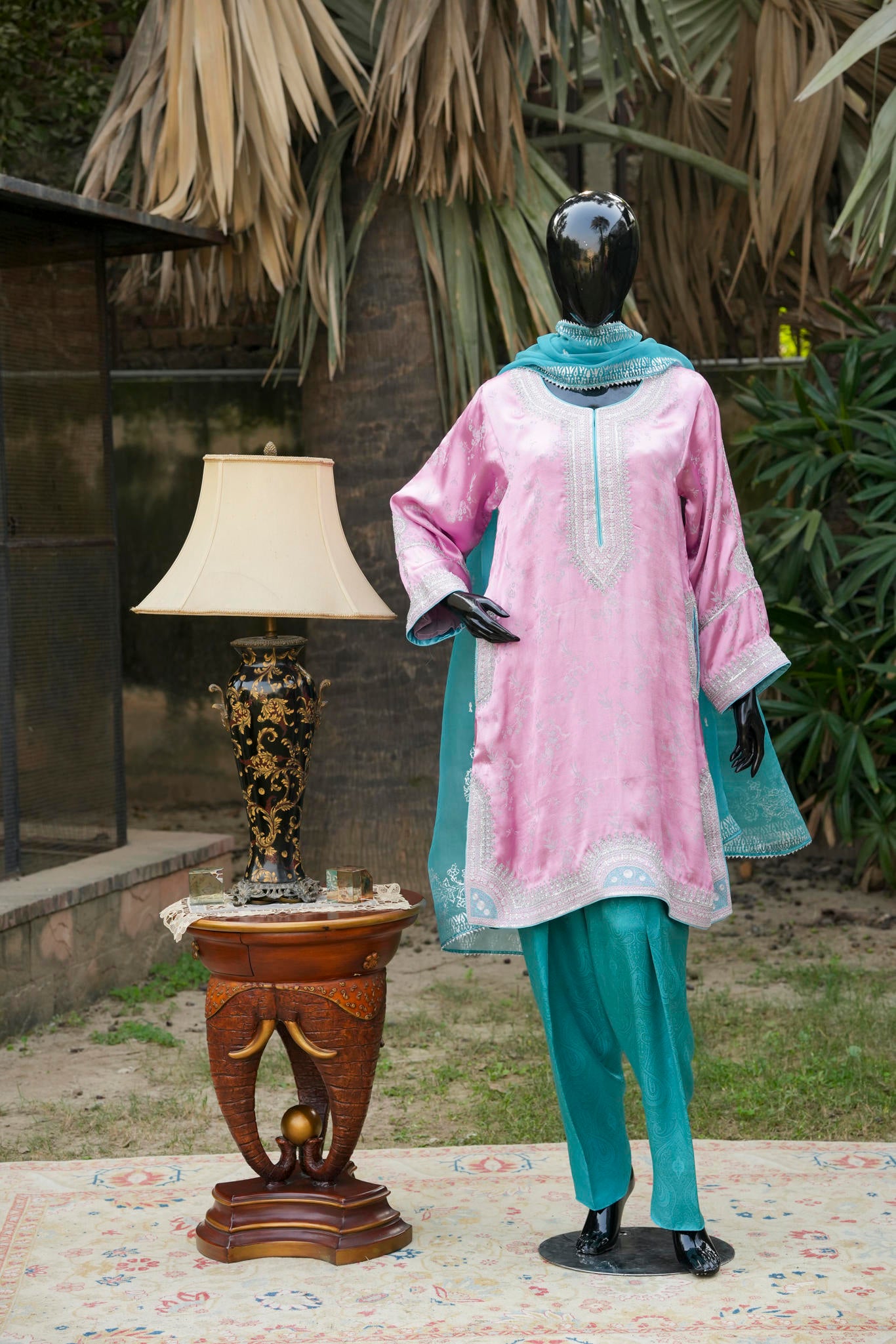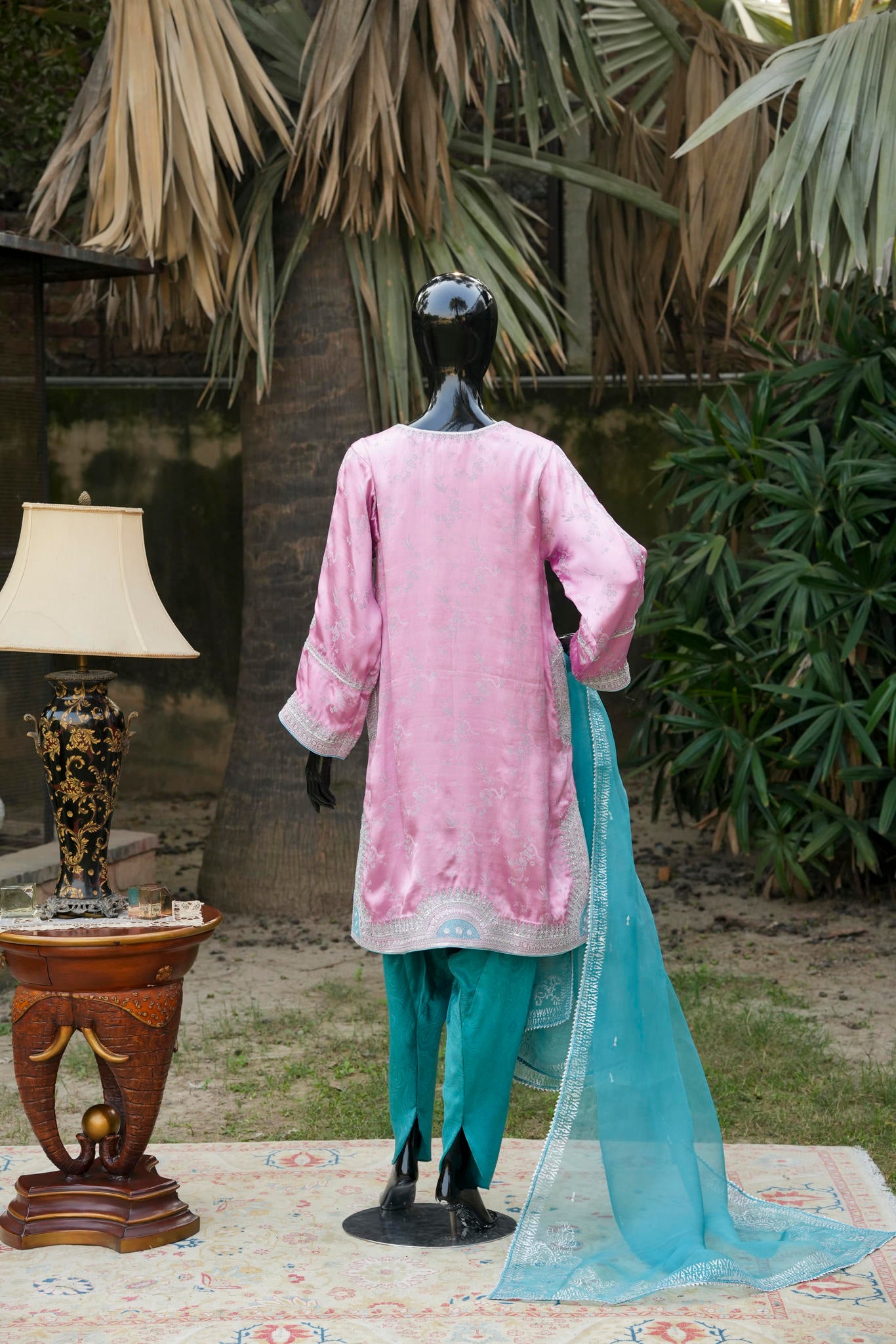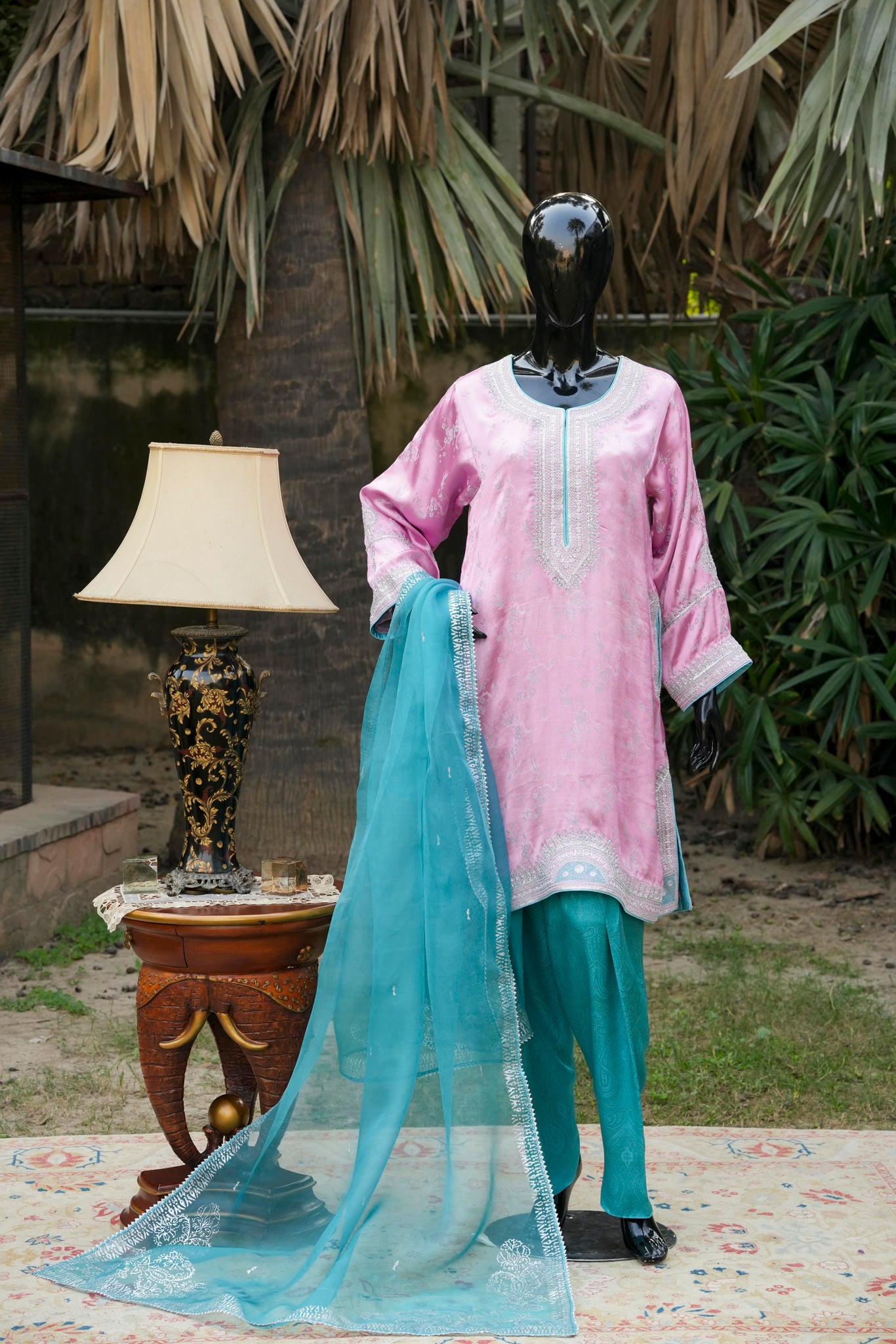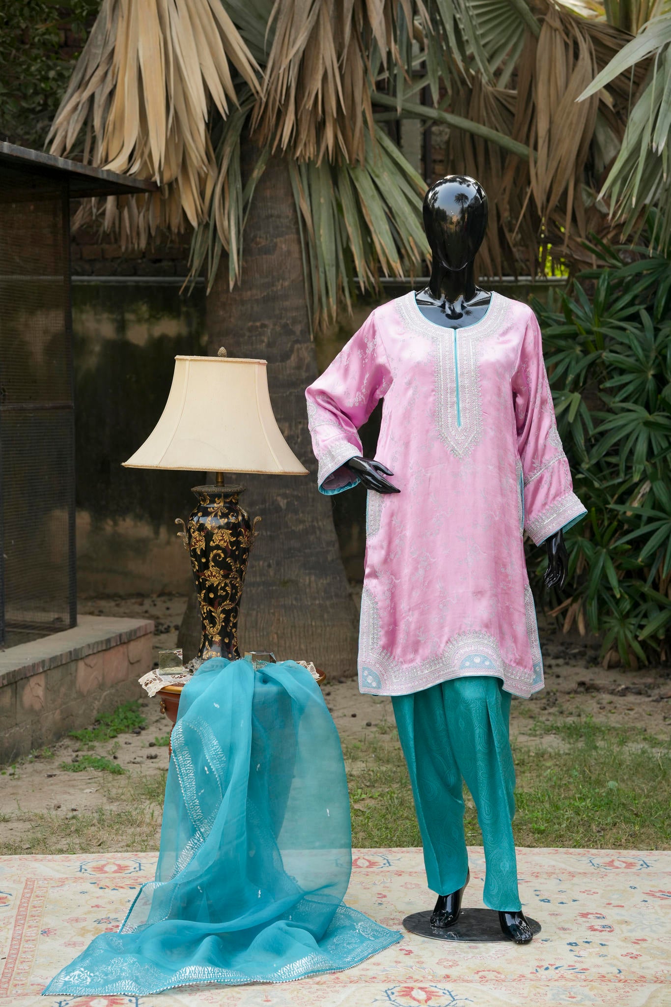 A loose short kurta in a soft silvery-pink hue, delicately embellished with traditional silver maroori embroidery, paired with a contrasting shalwar. A refined expression of understated luxury, blending classic craftsmanship with contemporary ease.